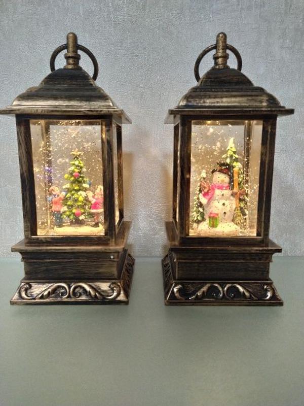 dekorativnyj novogodnij svetilnik fonar so snegom vnutri kids tree